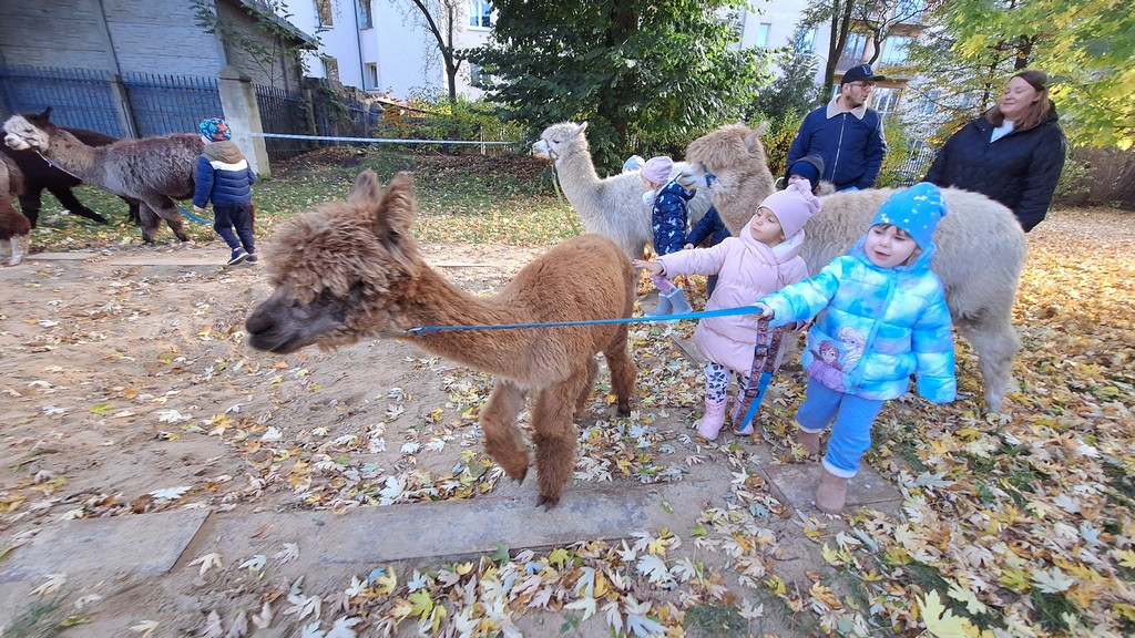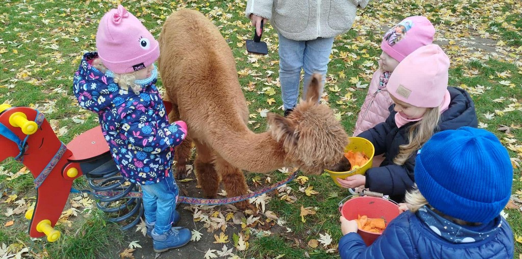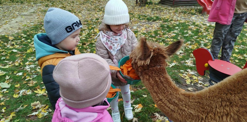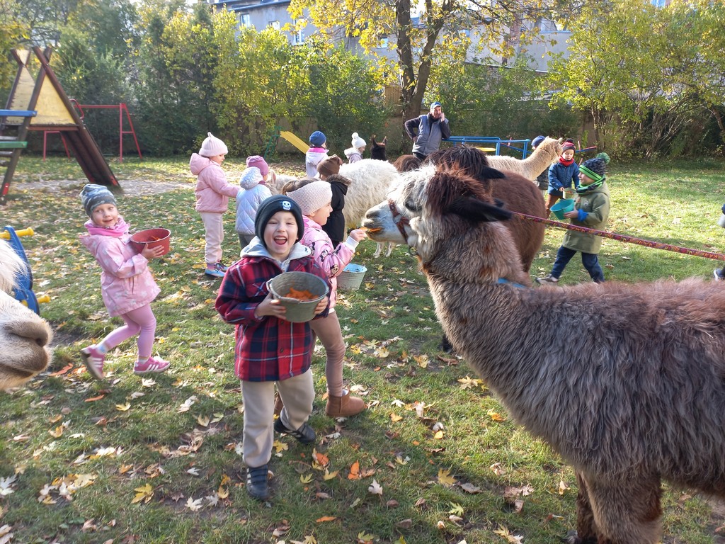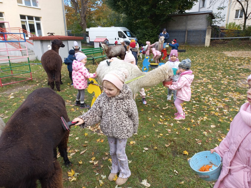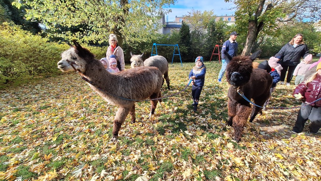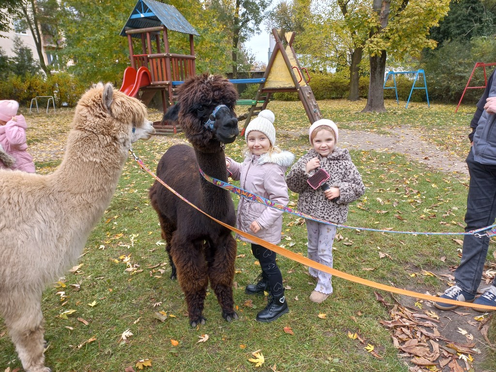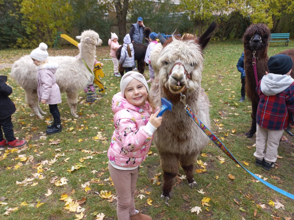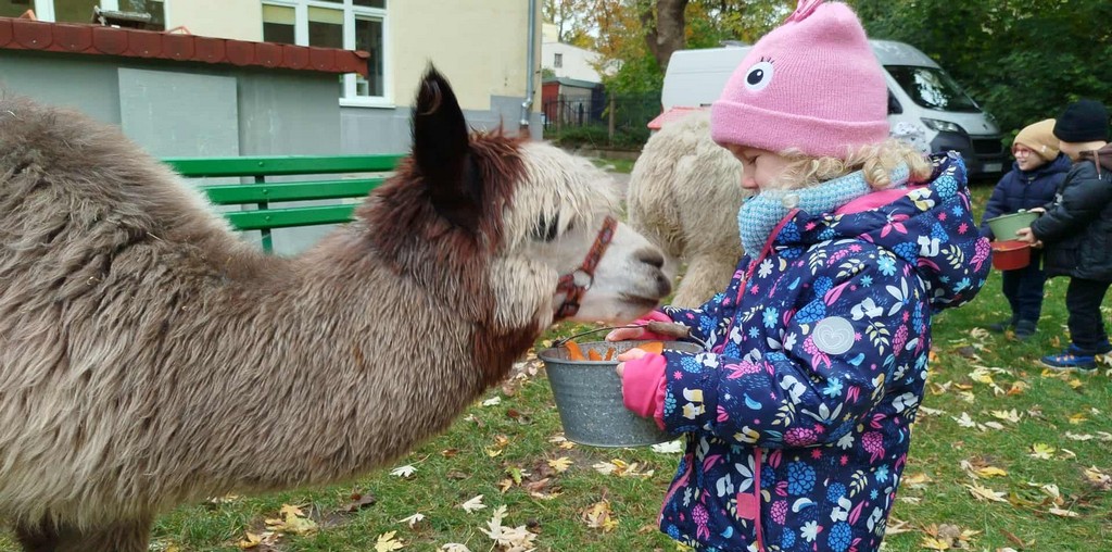 W październiku przyjechały do nas Alpaki z Orzechove AlpakoweLove. Dzieci dowiedziały się jak trzeba opiekować się alpakami i jak wygląda ich hodowla. Karmiły zwierzątka ich przysmakiem (marchewkami), spacerowały z alpakami po ogrodzie, głaskały, przytulały się do ich mięciutkiego futerka i je czesały. Opiekun tych cudnych zwierząt dzieciom starszym opowiadał o życiu alpak w ich naturalnym środowisku i odpowiadał na wszystkie pytania, by zaspokoić ciekawość dzieci.