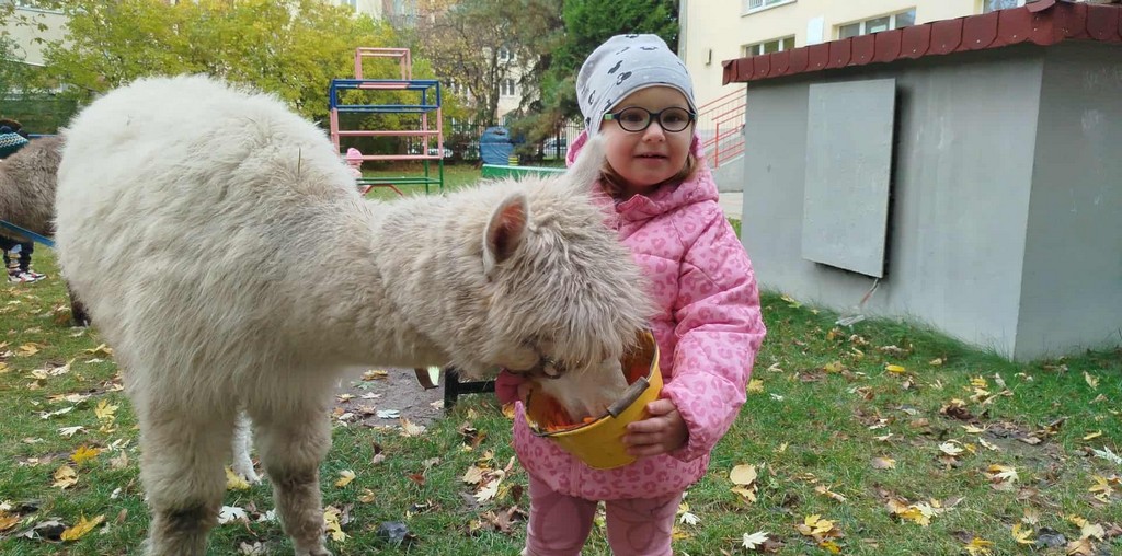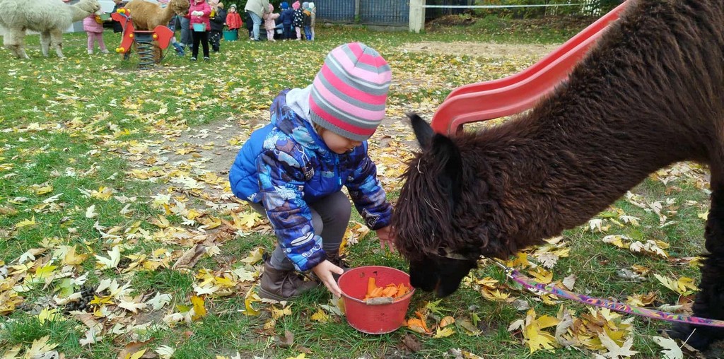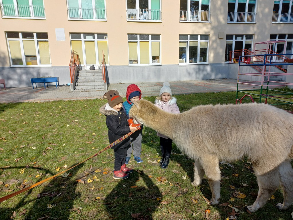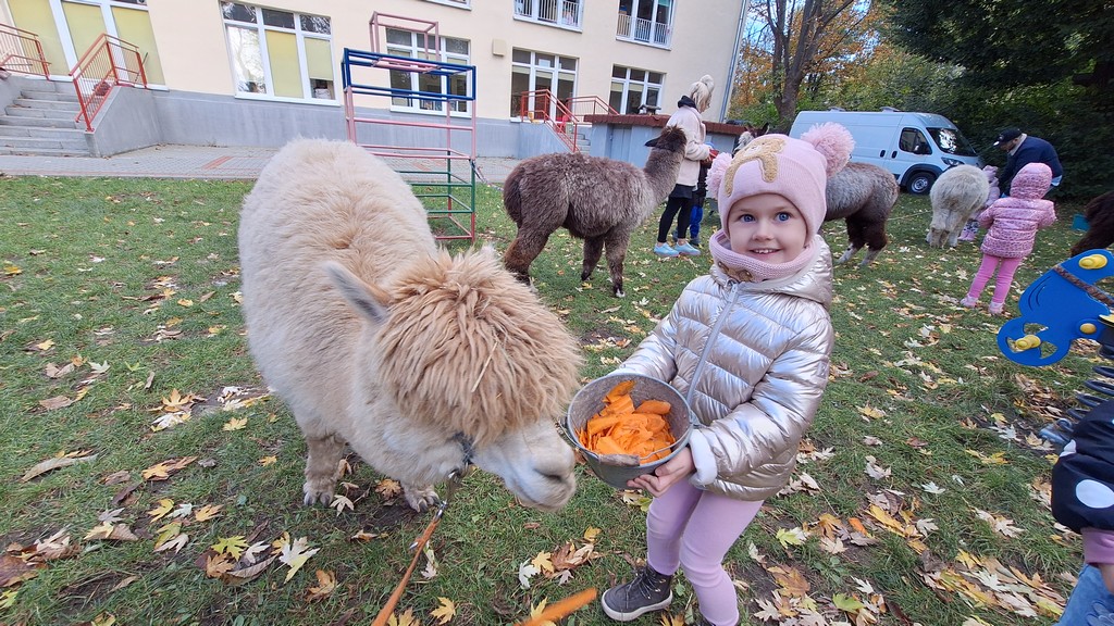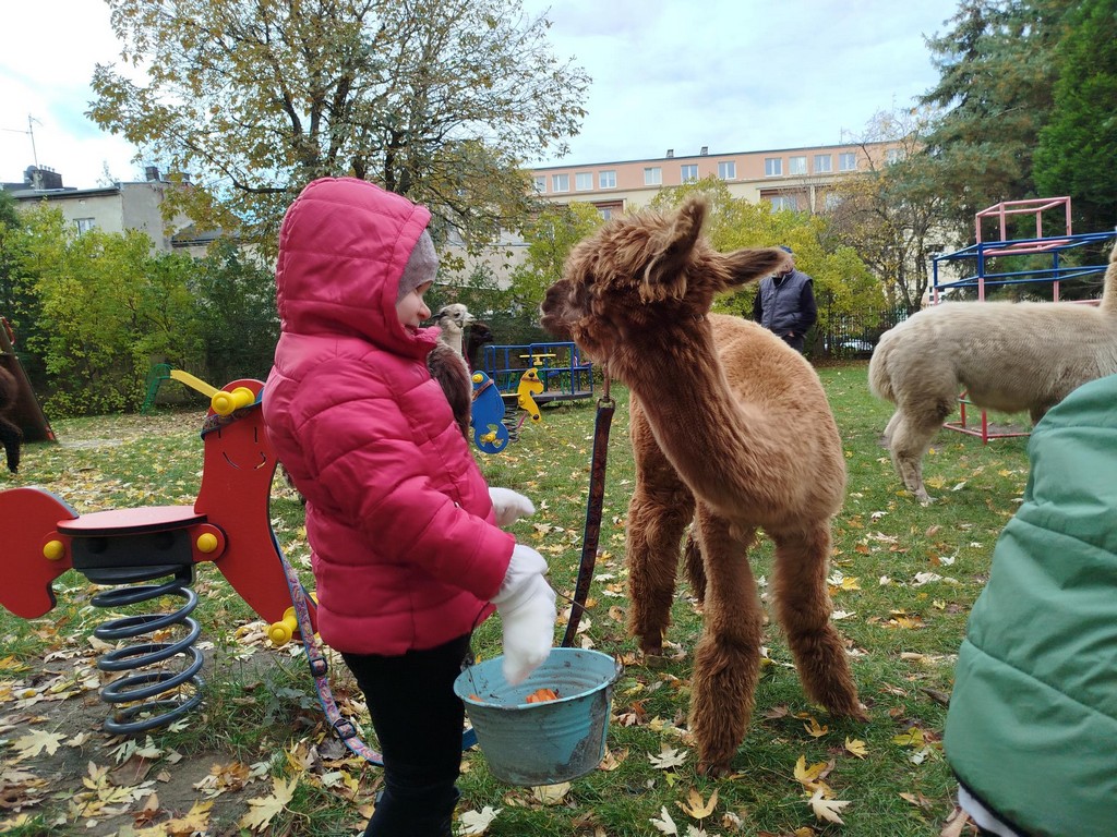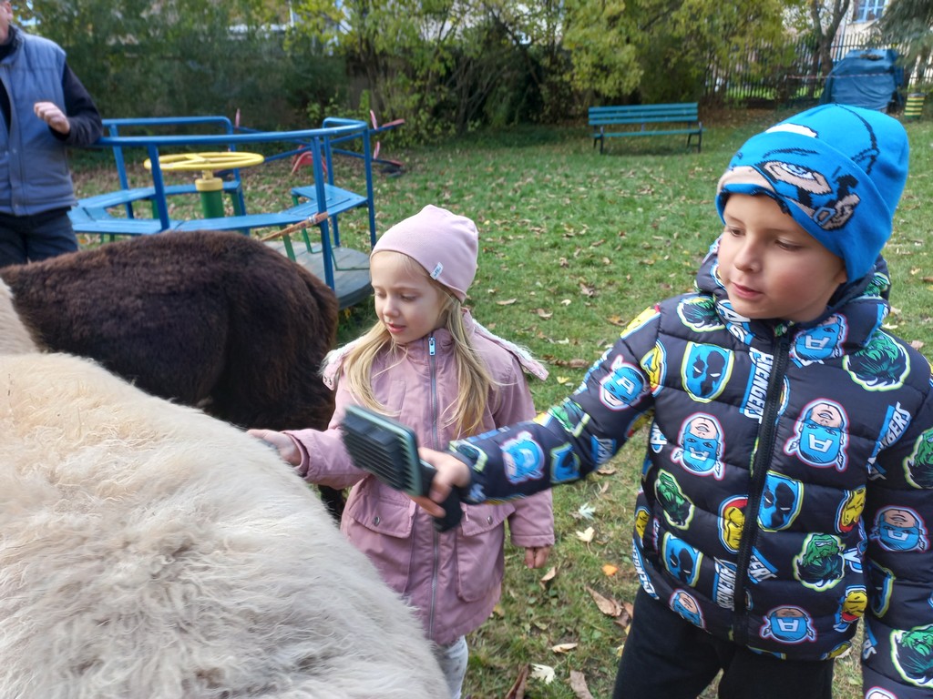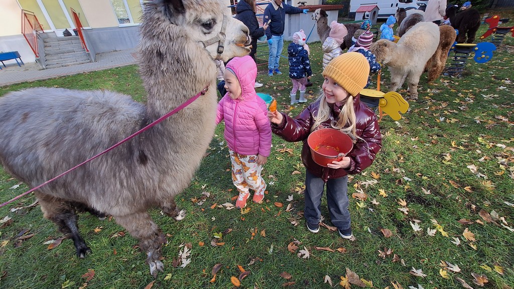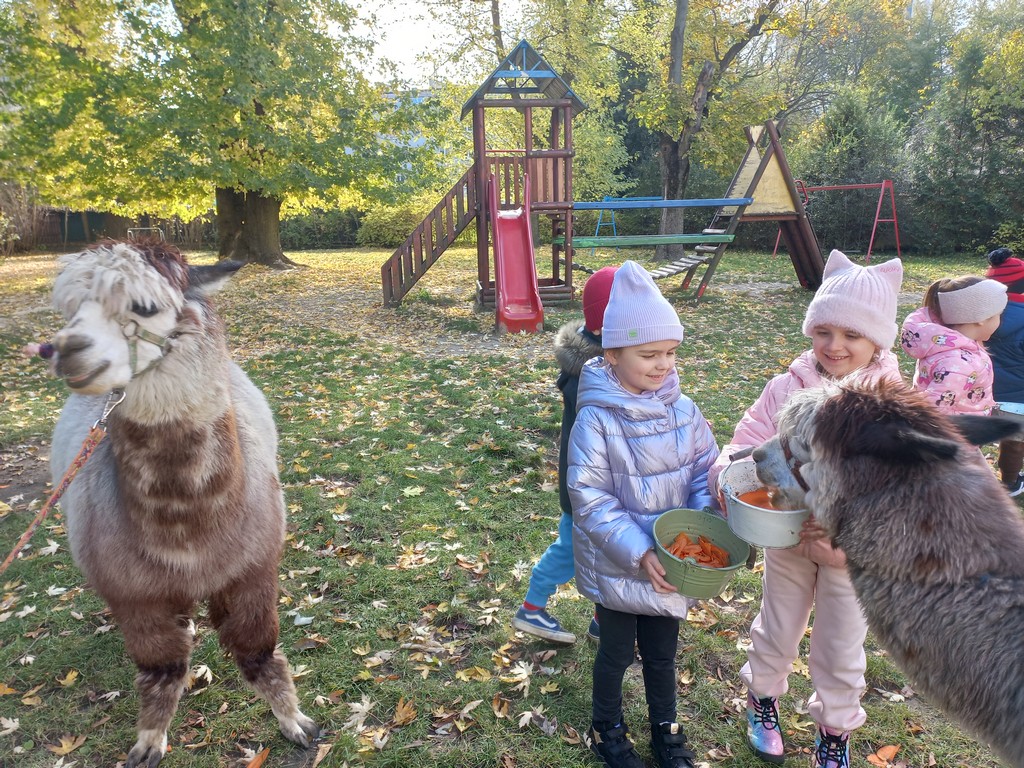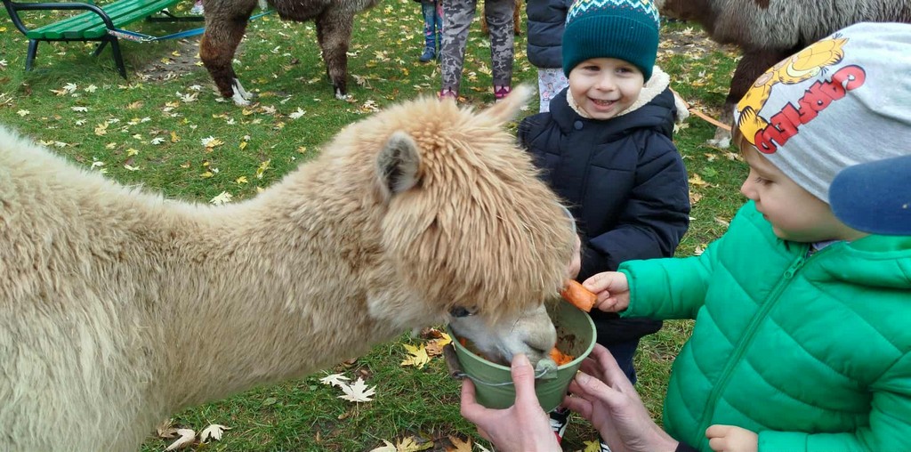 W październiku przyjechały do nas Alpaki z Orzechove AlpakoweLove. Dzieci dowiedziały się jak trzeba opiekować się alpakami i jak wygląda ich hodowla. Karmiły zwierzątka ich przysmakiem (marchewkami), spacerowały z alpakami po ogrodzie, głaskały, przytulały się do ich mięciutkiego futerka i je czesały. Opiekun tych cudnych zwierząt dzieciom starszym opowiadał o życiu alpak w ich naturalnym środowisku i odpowiadał na wszystkie pytania, by zaspokoić ciekawość dzieci.