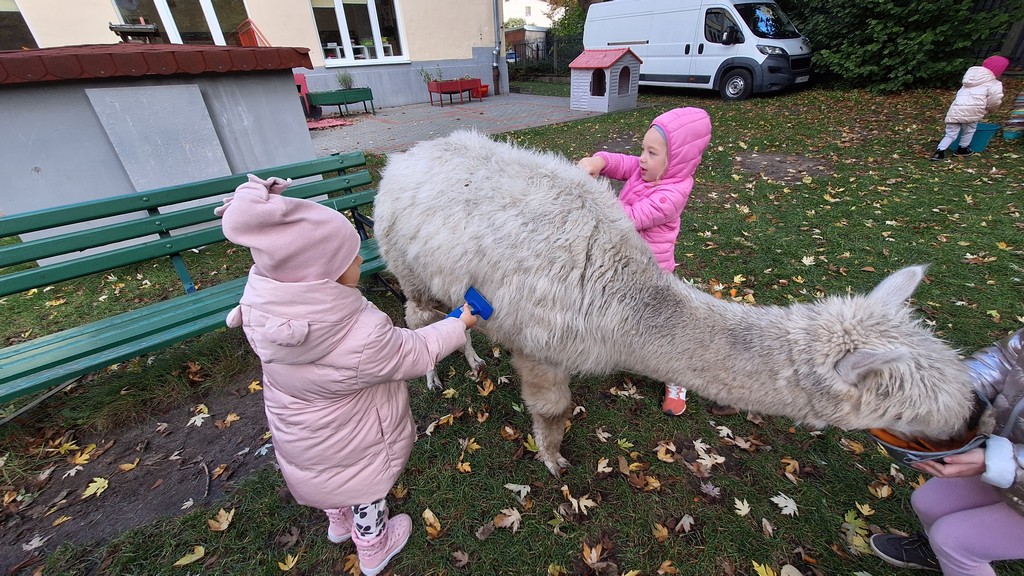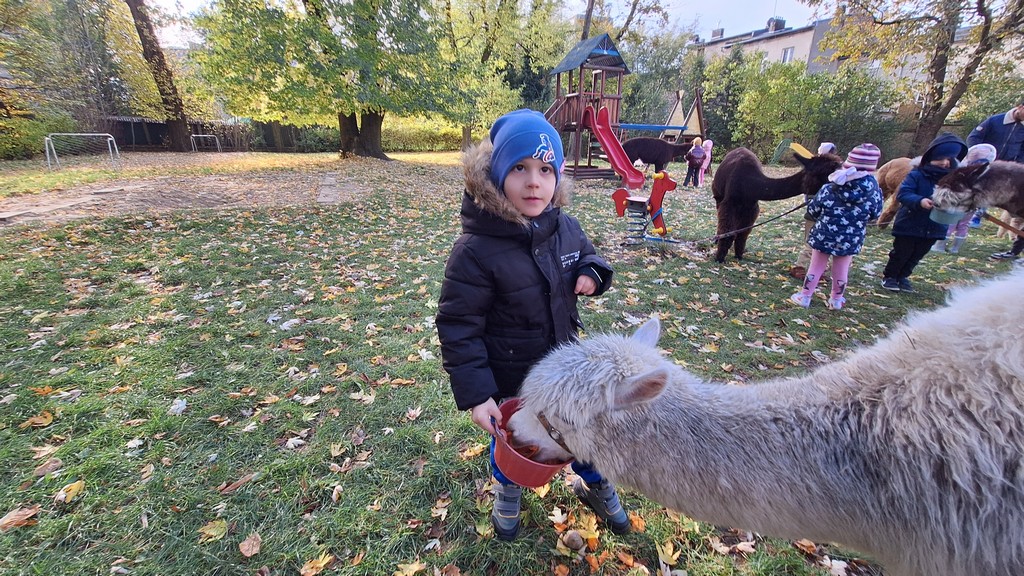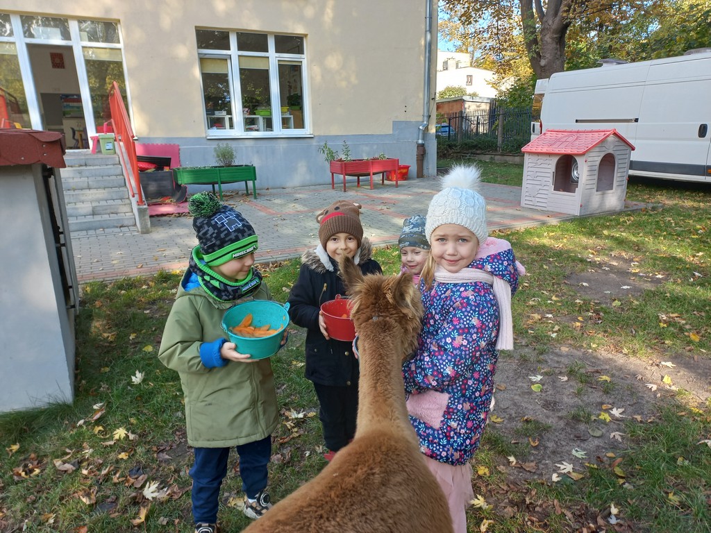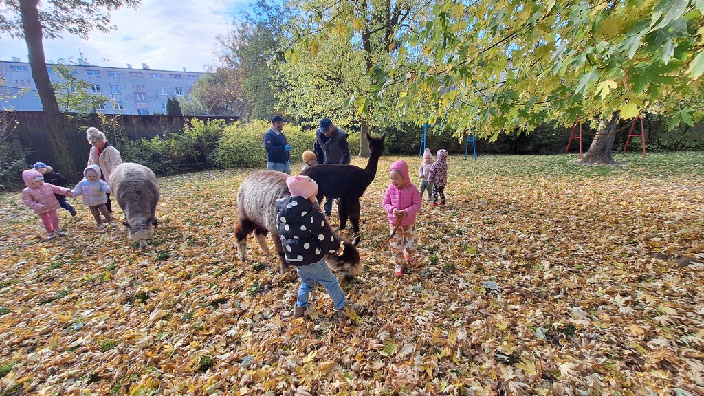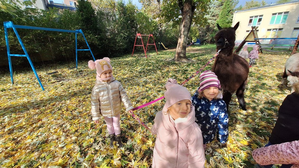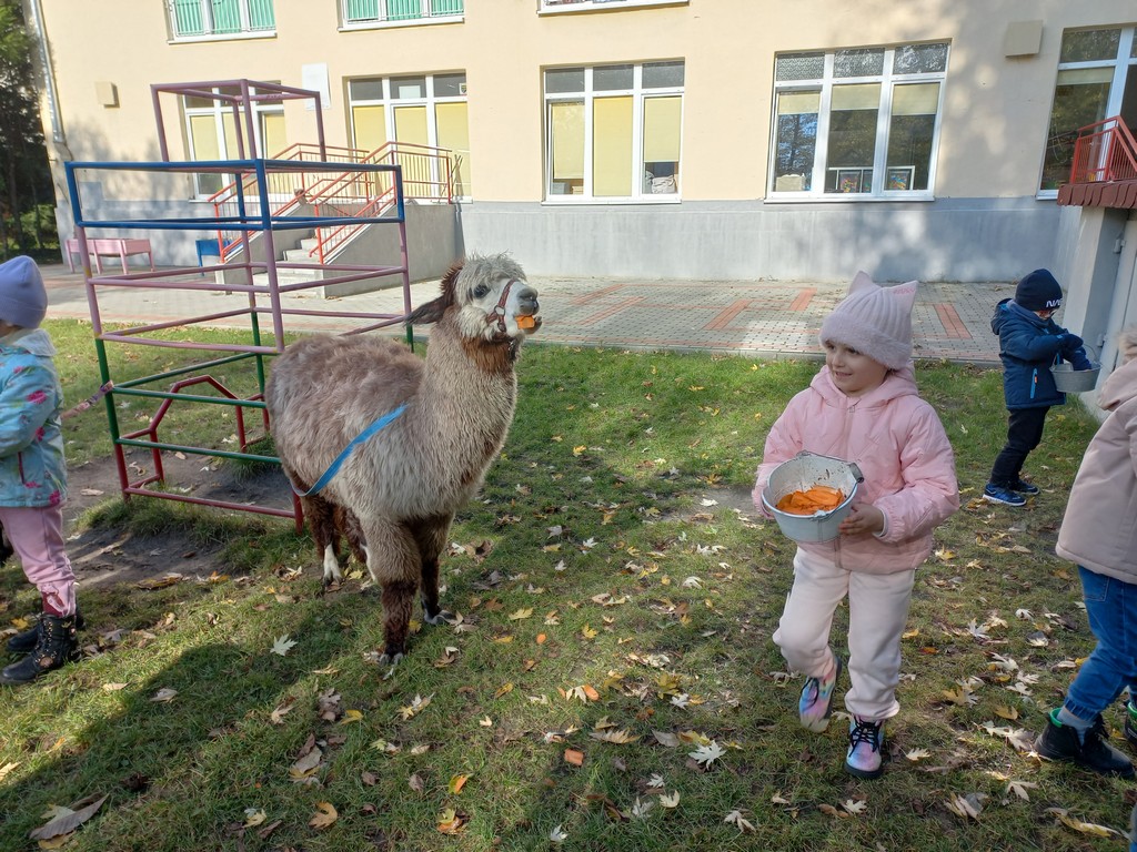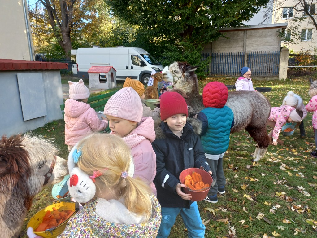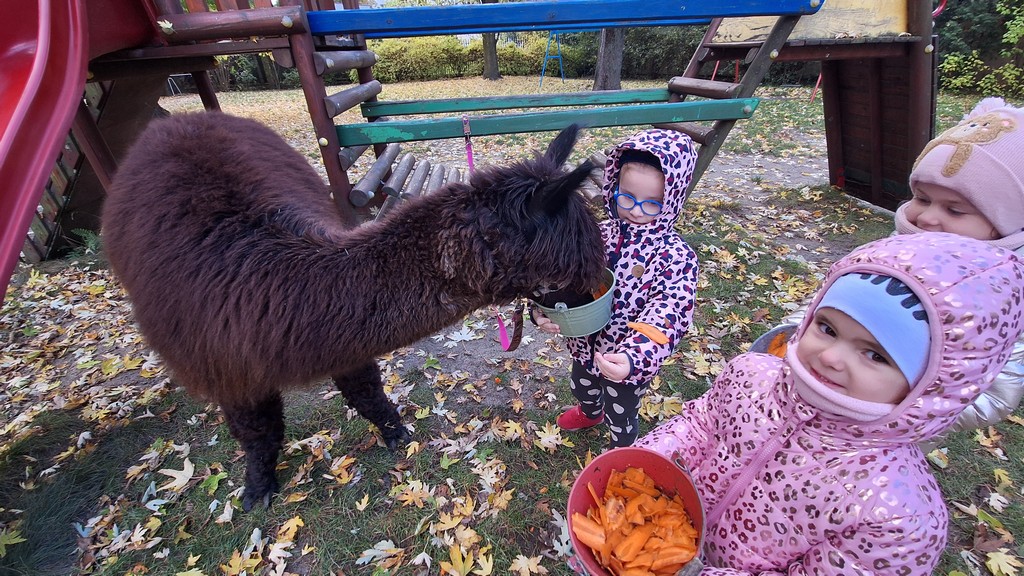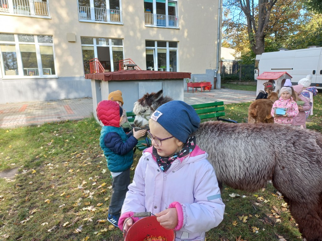 W październiku przyjechały do nas Alpaki z Orzechove AlpakoweLove. Dzieci dowiedziały się jak trzeba opiekować się alpakami i jak wygląda ich hodowla. Karmiły zwierzątka ich przysmakiem (marchewkami), spacerowały z alpakami po ogrodzie, głaskały, przytulały się do ich mięciutkiego futerka i je czesały. Opiekun tych cudnych zwierząt dzieciom starszym opowiadał o życiu alpak w ich naturalnym środowisku i odpowiadał na wszystkie pytania, by zaspokoić ciekawość dzieci.