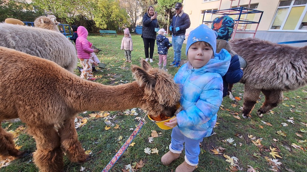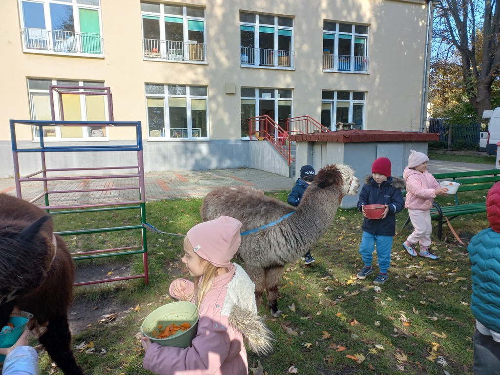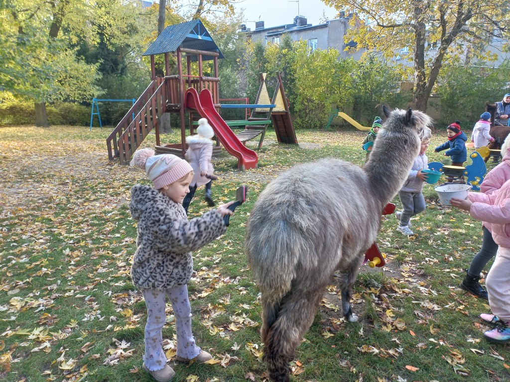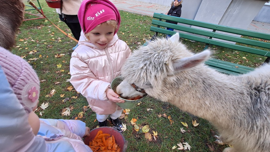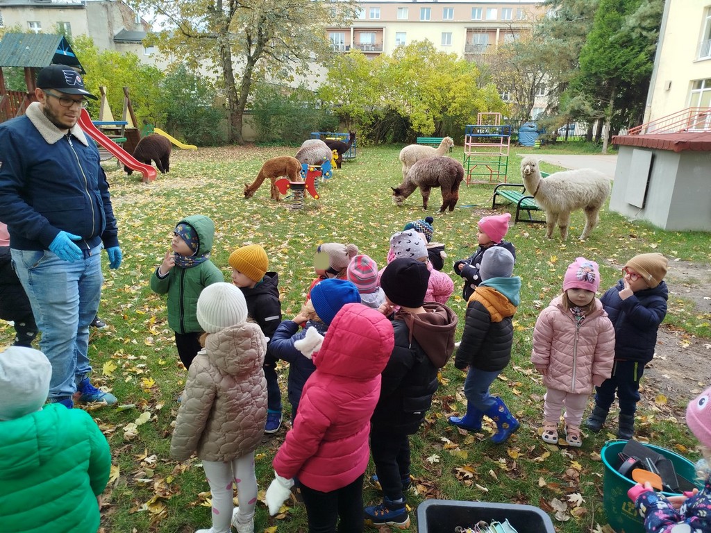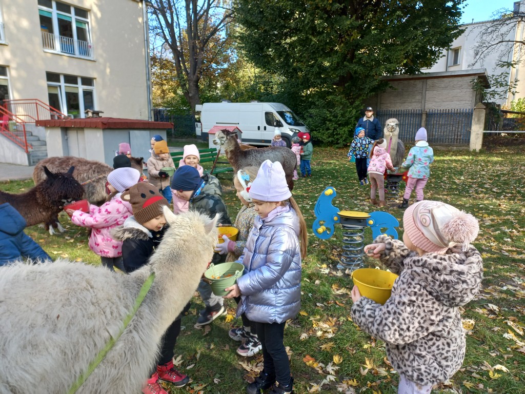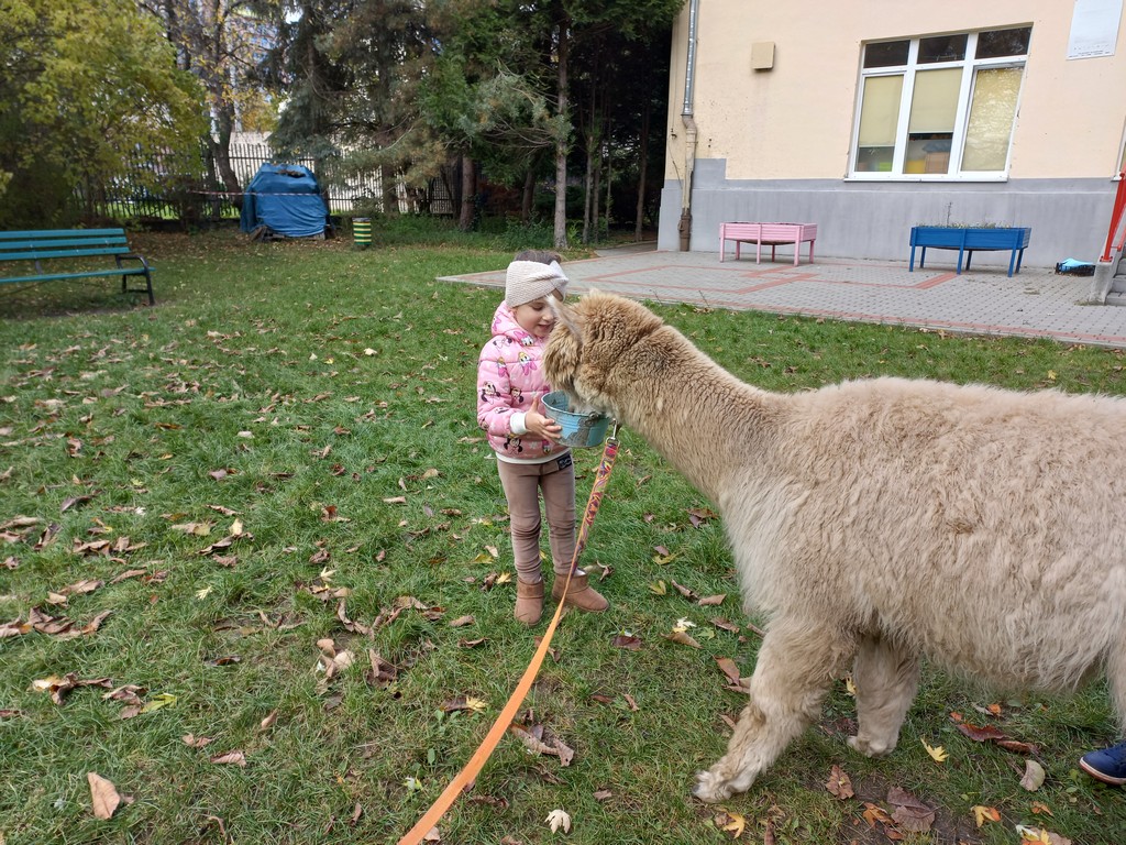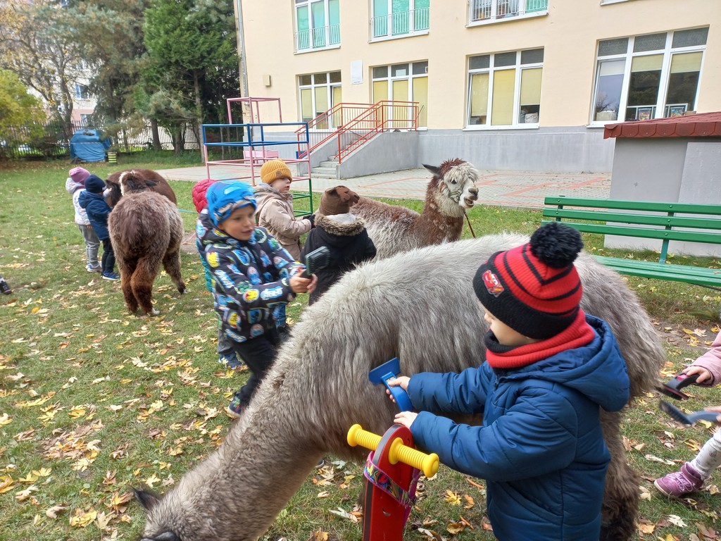 W październiku przyjechały do nas Alpaki z Orzechove AlpakoweLove. Dzieci dowiedziały się jak trzeba opiekować się alpakami i jak wygląda ich hodowla. Karmiły zwierzątka ich przysmakiem (marchewkami), spacerowały z alpakami po ogrodzie, głaskały, przytulały się do ich mięciutkiego futerka i je czesały. Opiekun tych cudnych zwierząt dzieciom starszym opowiadał o życiu alpak w ich naturalnym środowisku i odpowiadał na wszystkie pytania, by zaspokoić ciekawość dzieci.