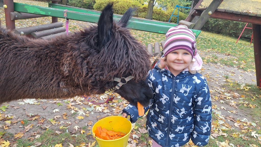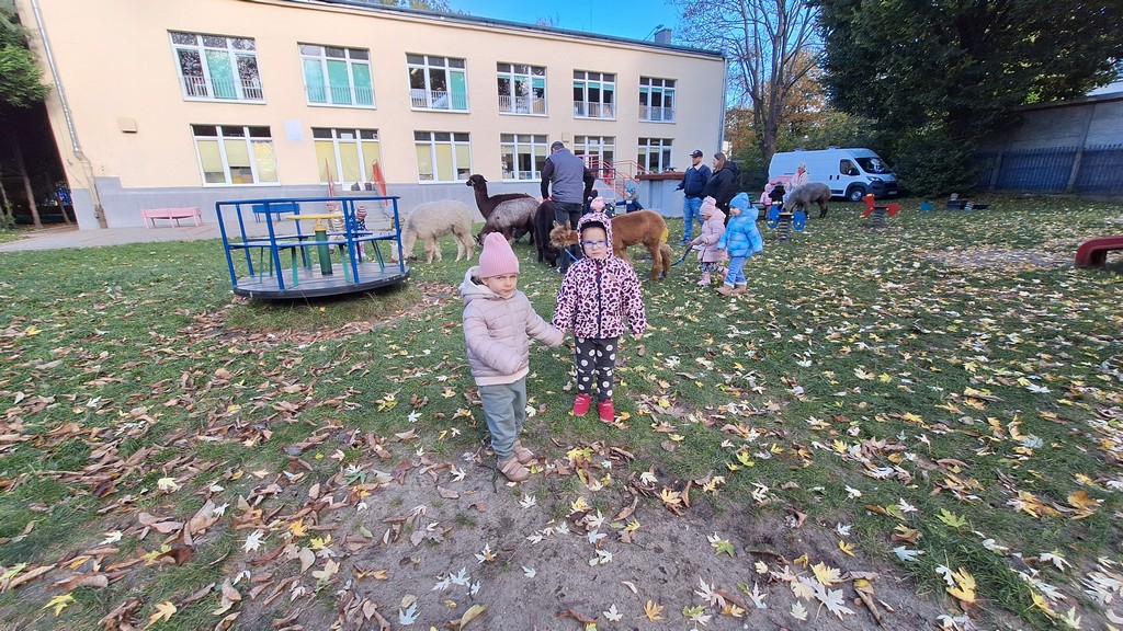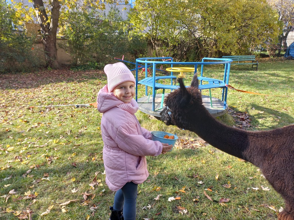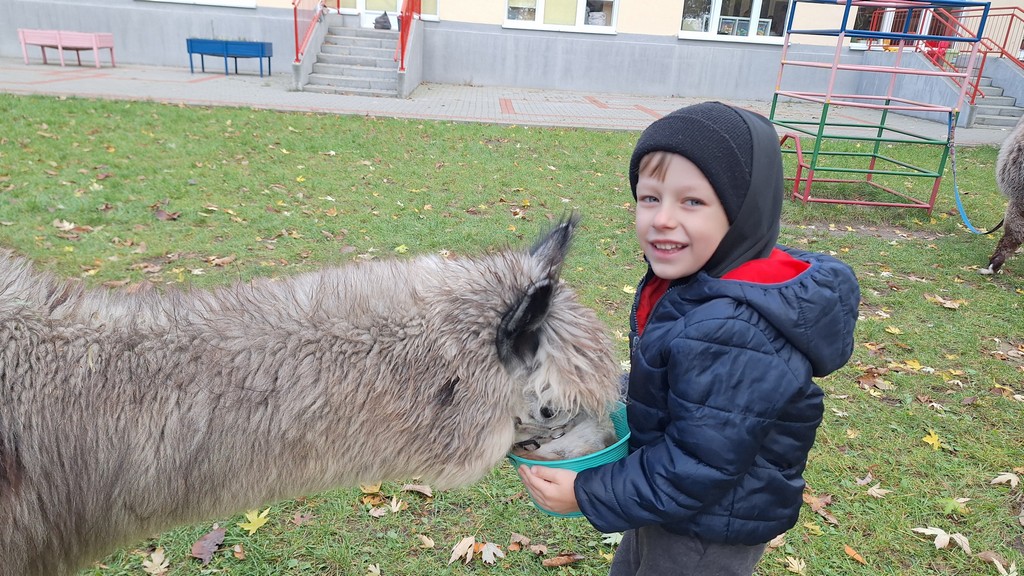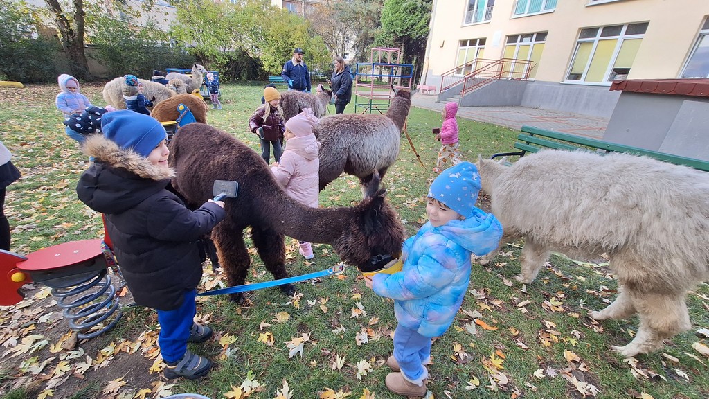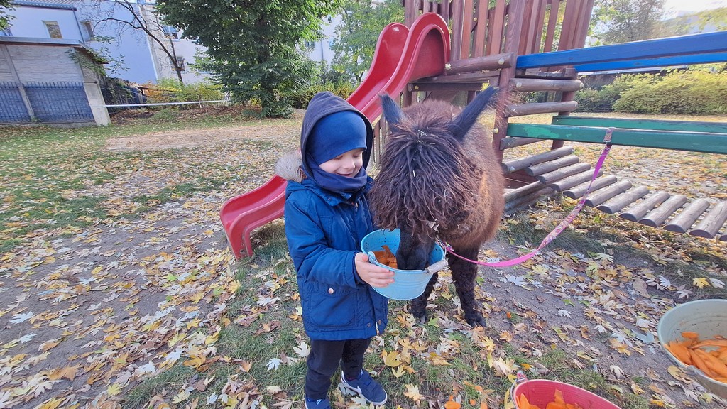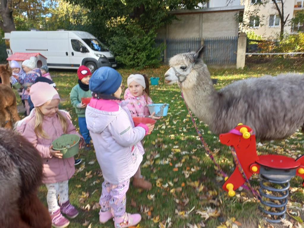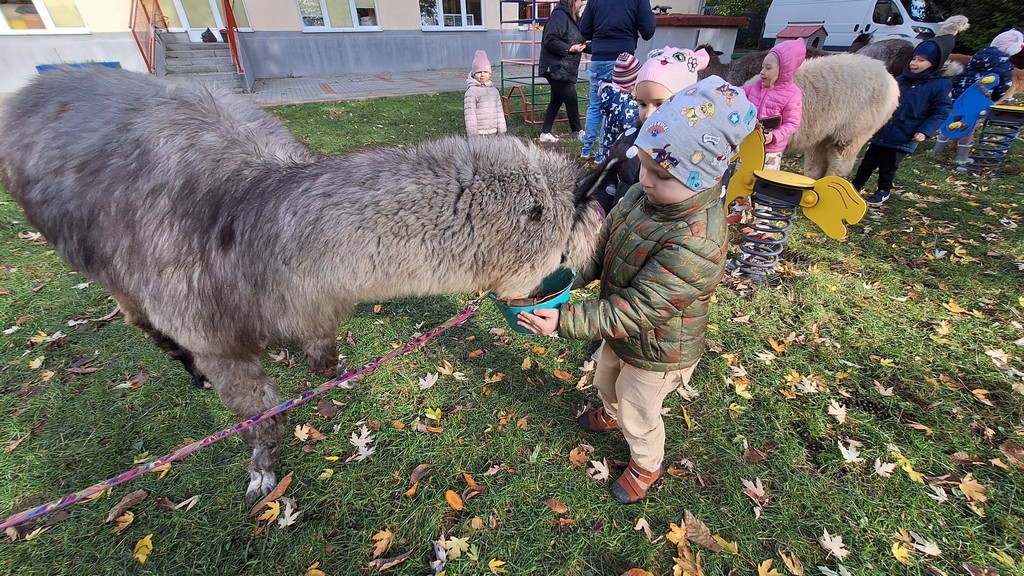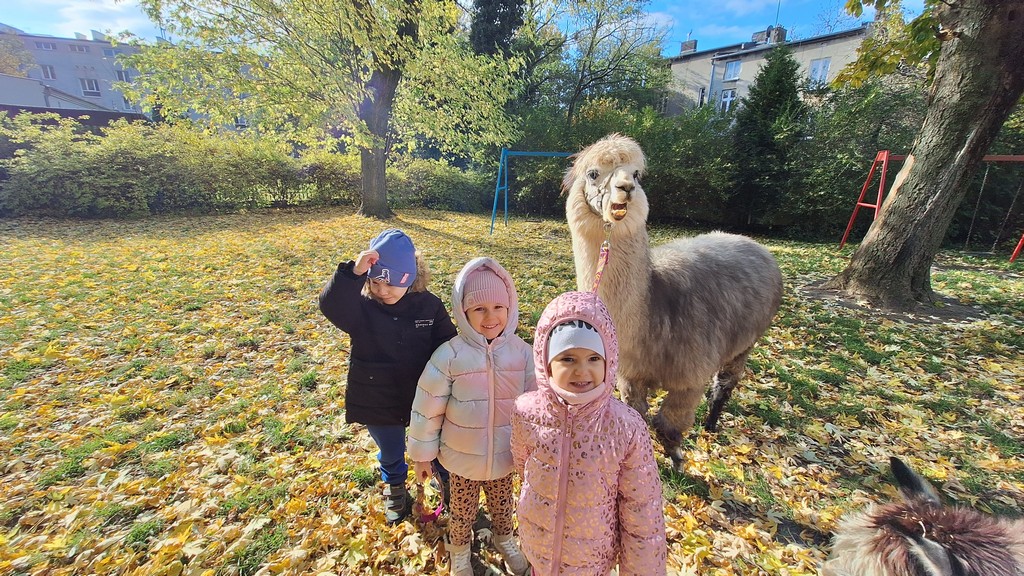 W październiku przyjechały do nas Alpaki z Orzechove AlpakoweLove. Dzieci dowiedziały się jak trzeba opiekować się alpakami i jak wygląda ich hodowla. Karmiły zwierzątka ich przysmakiem (marchewkami), spacerowały z alpakami po ogrodzie, głaskały, przytulały się do ich mięciutkiego futerka i je czesały. Opiekun tych cudnych zwierząt dzieciom starszym opowiadał o życiu alpak w ich naturalnym środowisku i odpowiadał na wszystkie pytania, by zaspokoić ciekawość dzieci.