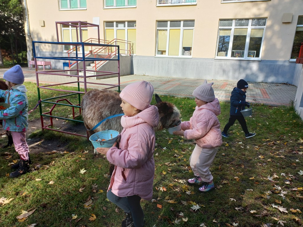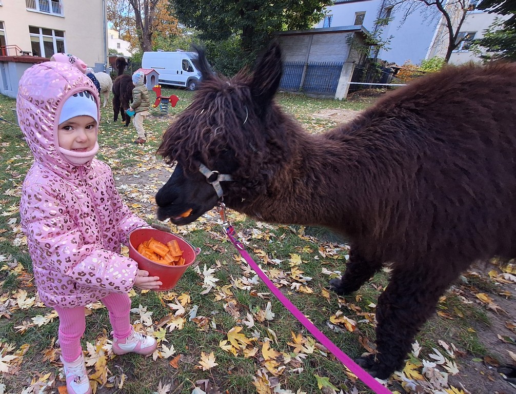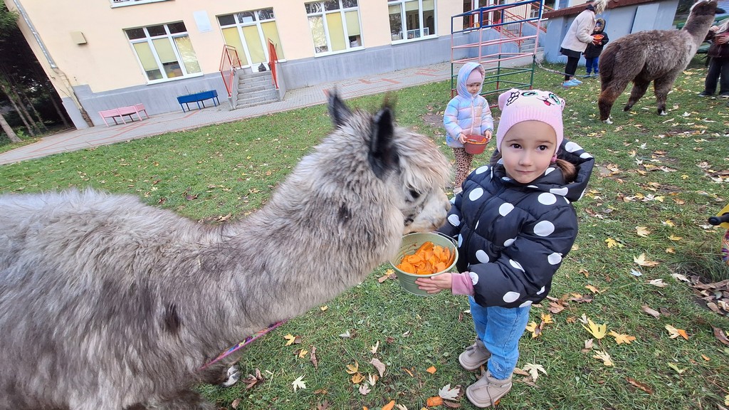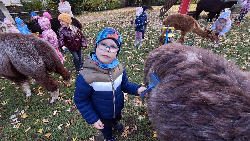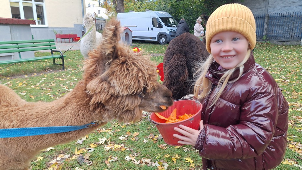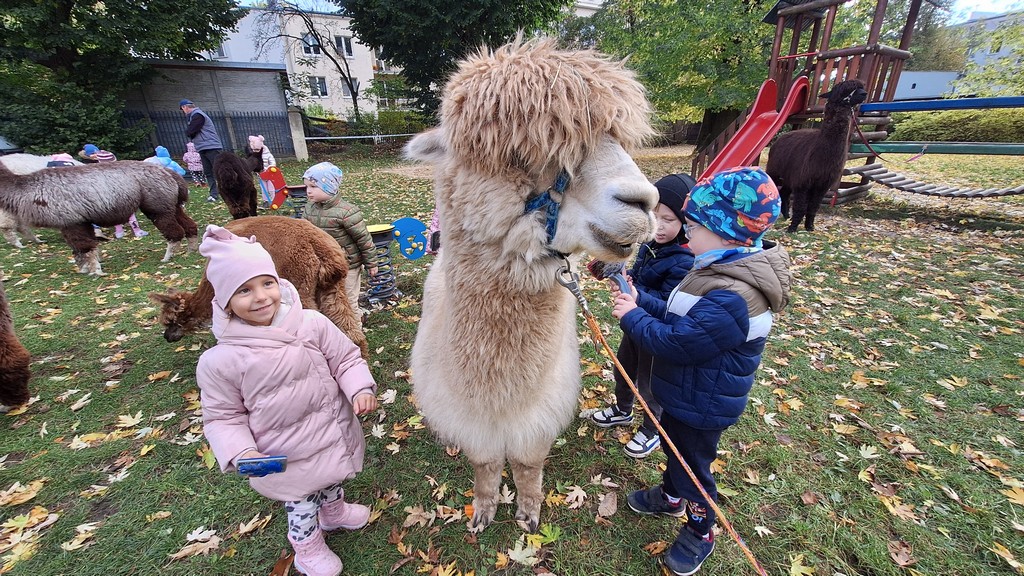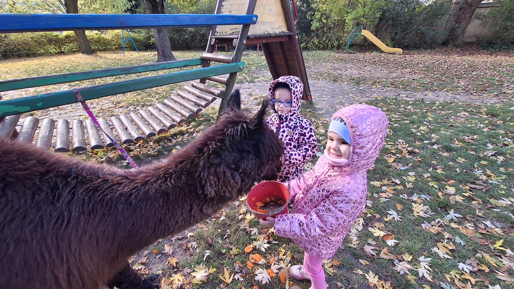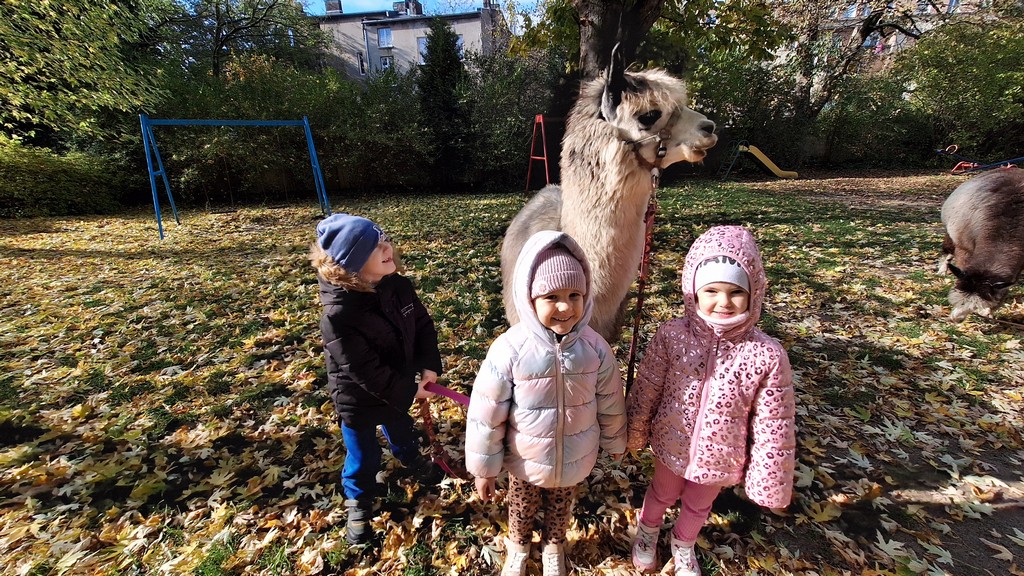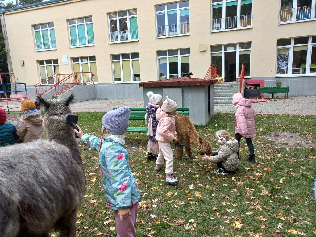W październiku przyjechały do nas Alpaki z Orzechove AlpakoweLove. Dzieci dowiedziały się jak trzeba opiekować się alpakami i jak wygląda ich hodowla. Karmiły zwierzątka ich przysmakiem (marchewkami), spacerowały z alpakami po ogrodzie, głaskały, przytulały się do ich mięciutkiego futerka i je czesały. Opiekun tych cudnych zwierząt dzieciom starszym opowiadał o życiu alpak w ich naturalnym środowisku i odpowiadał na wszystkie pytania, by zaspokoić ciekawość dzieci.