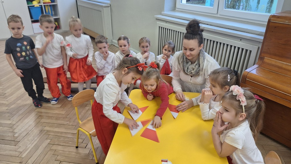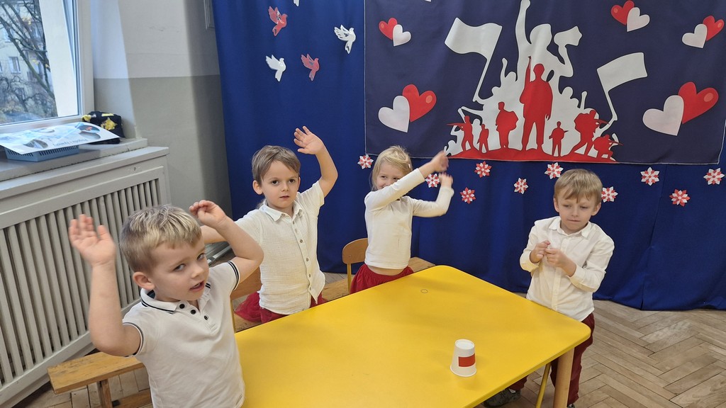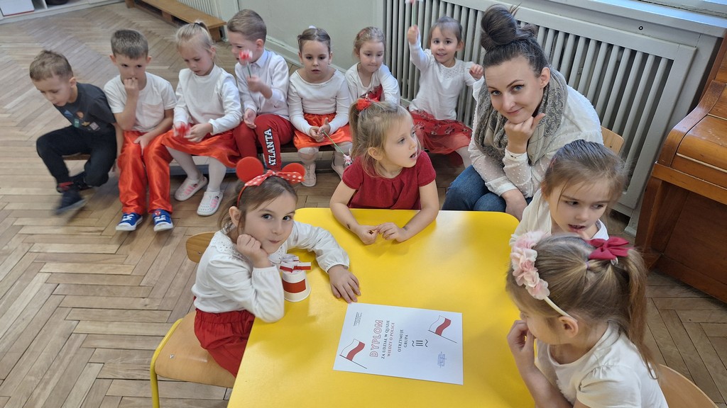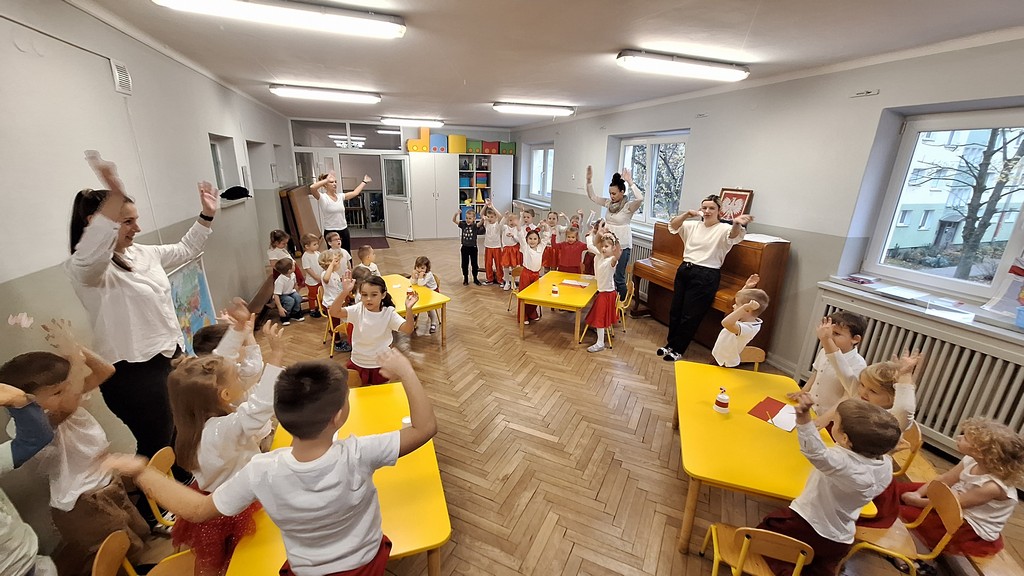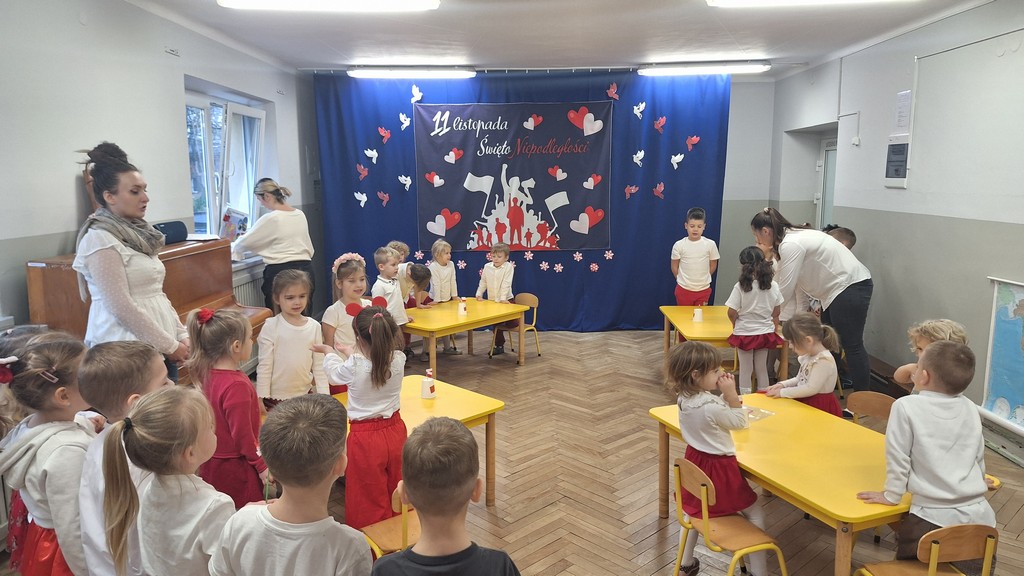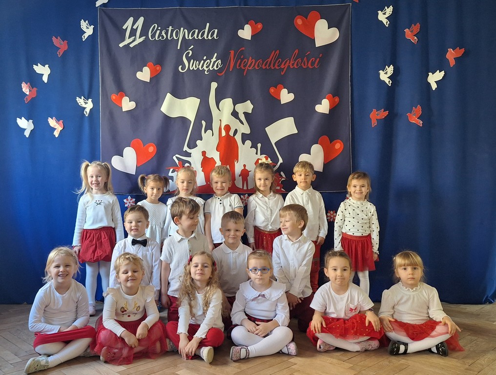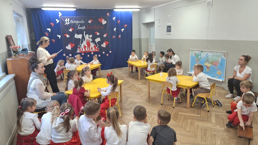 Wszystkich zebranych powitała pani Aleksandra zapraszając na program artystyczny w wykonaniu przedszkolaków. Dzieci w wierszach i piosenkach przytoczyły zarys historyczny odzyskania przez Polskę Niepodległości oraz oddały hołd Ojczyźnie . Ponadto nasze przedszkole wzięło udział w akcji organizowanej przez MEN ,,Szkoła do hymnu” podczas której o godzinie 11:11 wszyscy zgromadzeni odśpiewali Hymn Narodowy. Podsumowując zdobyte wiadomości i utrwalając wiedzę dzieci uczestniczyły w "Quizie wiedzy o Polsce", podczas którego wybrani reprezentanci z każdej grupy odpowiadali na pytania i wykonywali zadania dotyczące naszego kraju. Pozostałe dzieci podpowiadały na pytania dodatkowe, wspierały swoich kolegów i wykonywali zadania wspólne. Uroczystość ta z pewnością zapadnie wszystkim głęboko w pamięci. Dzień, który przeżyliśmy dumnie i z uśmiechem na twarzy, przyczyni się do kształtowania patriotycznych postaw naszych małych Polek i Polaków.
