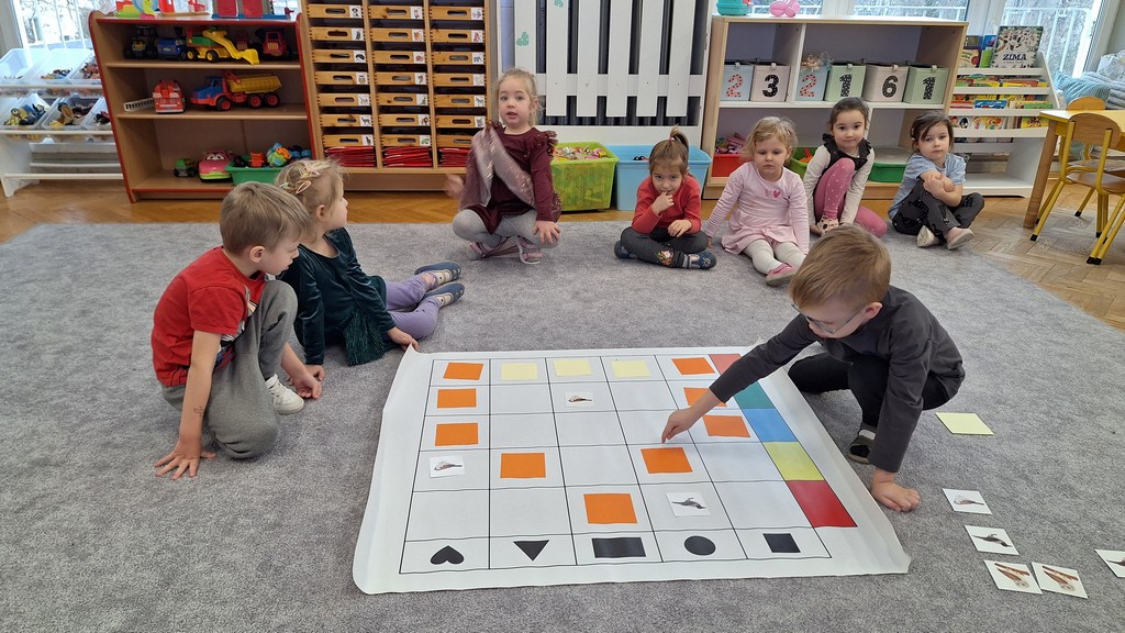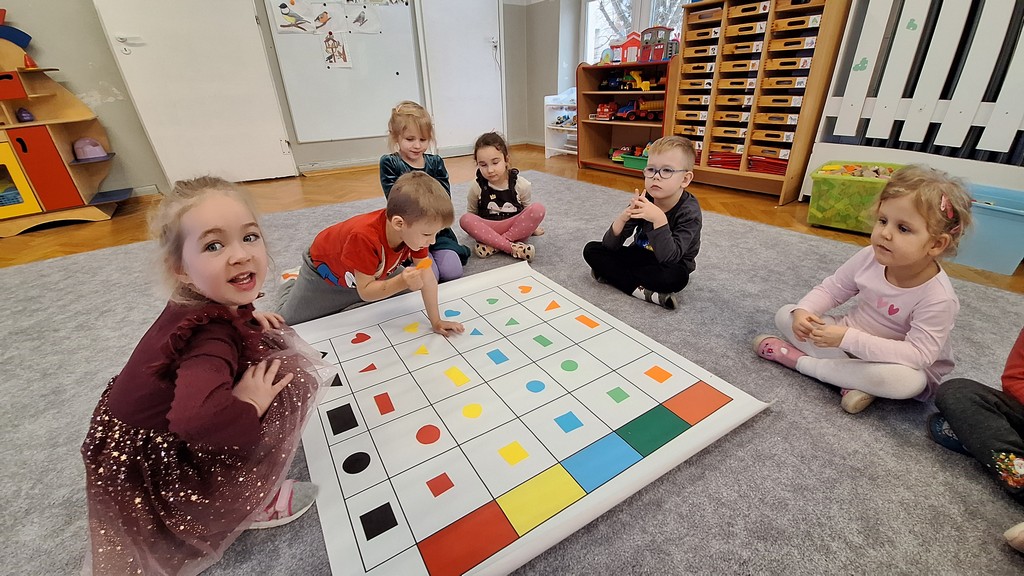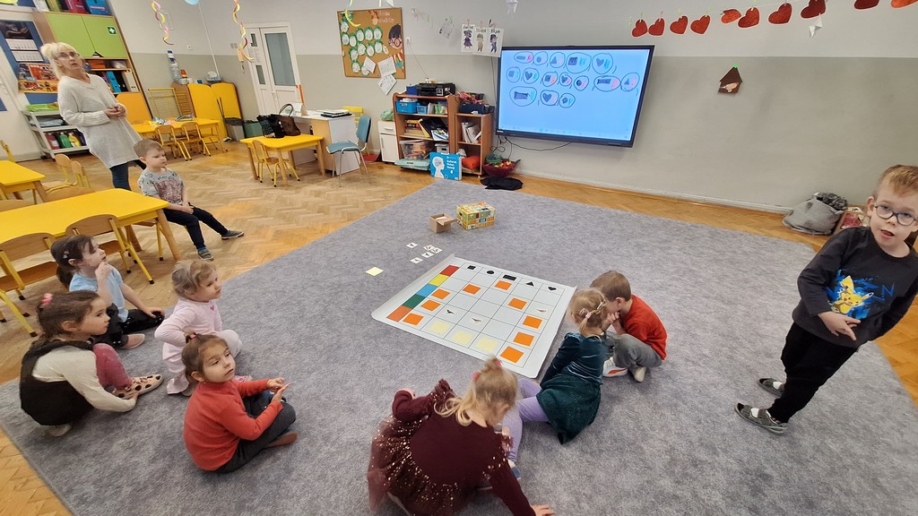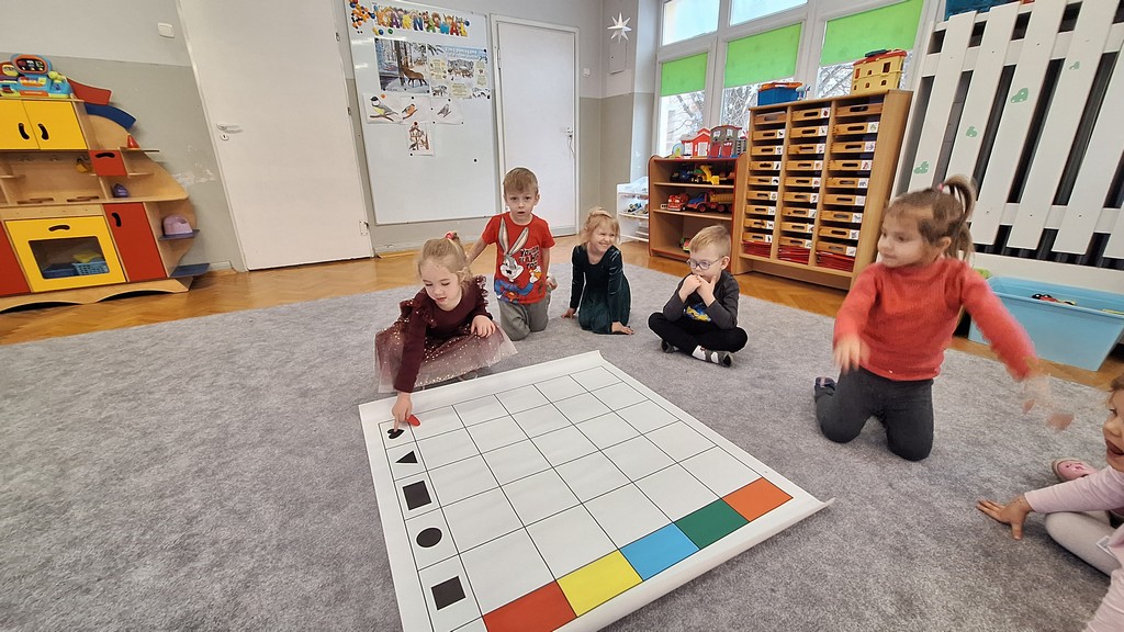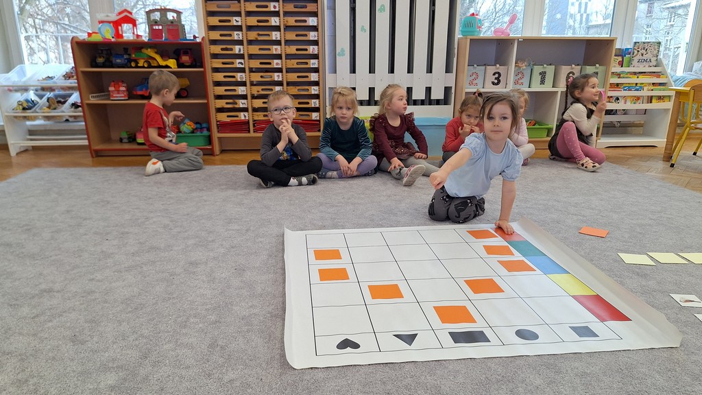 Rozpoczęliśmy także przygodę z kodowaniem wykorzystując matę i kolorowe kwadraty.