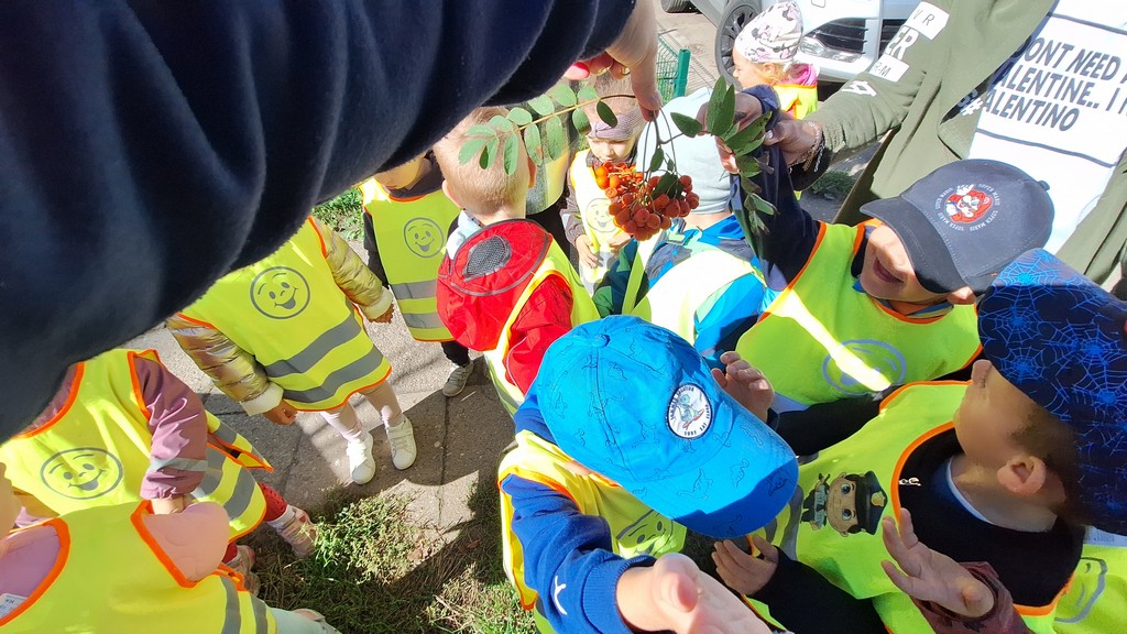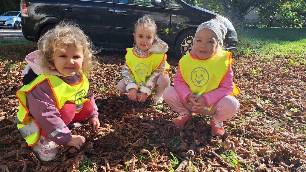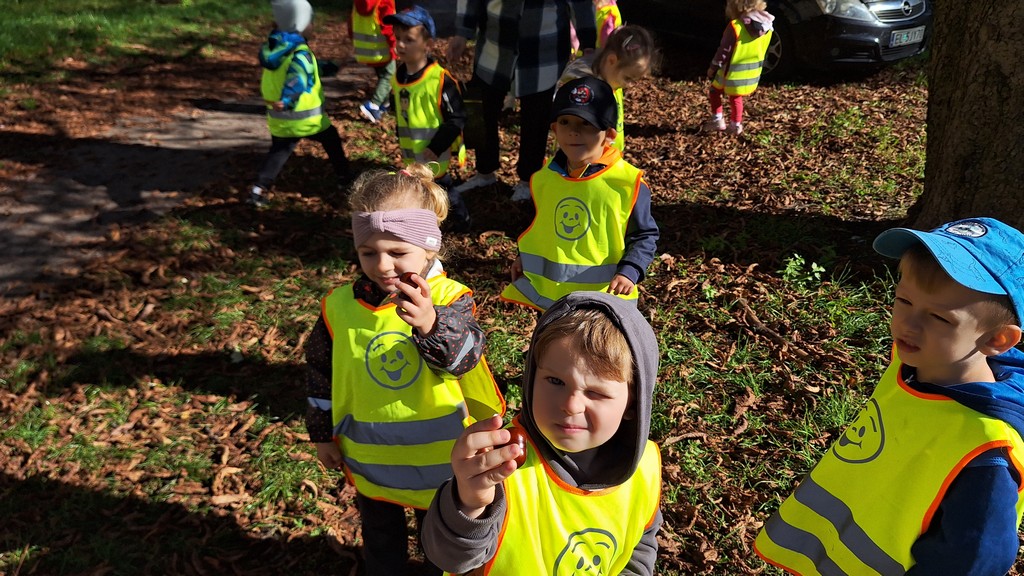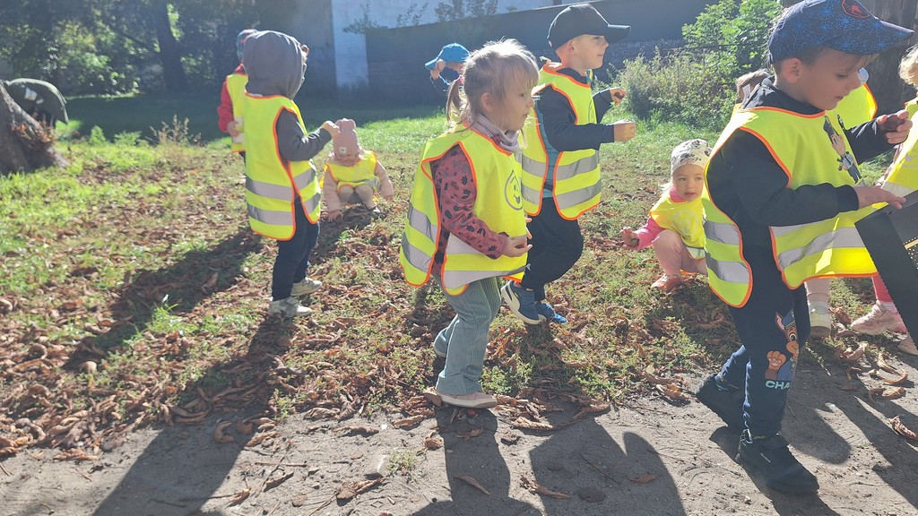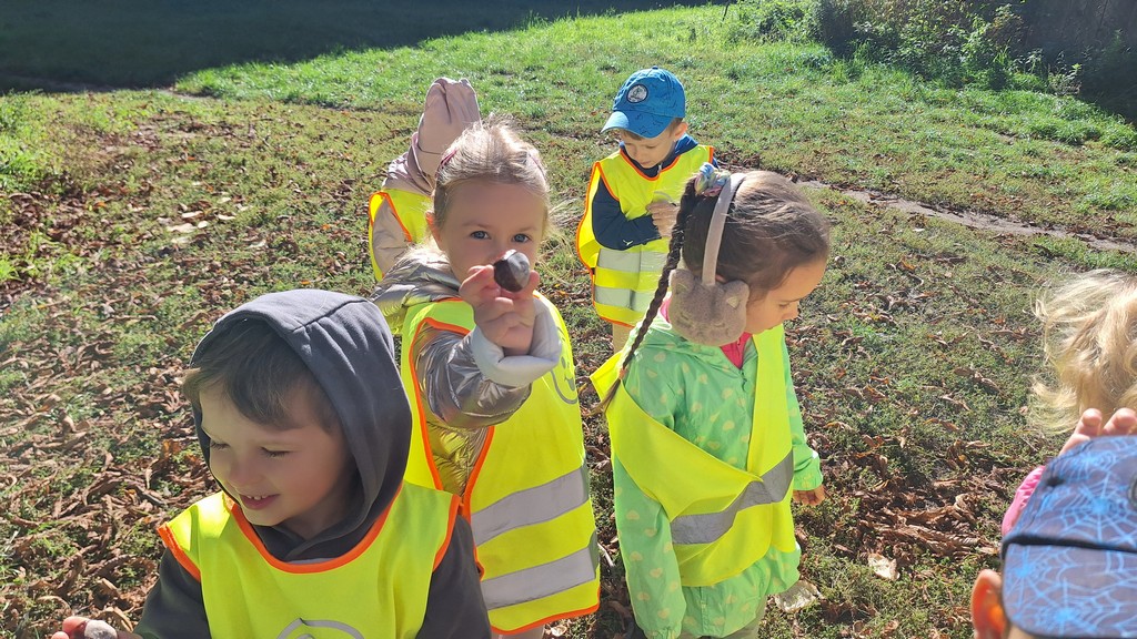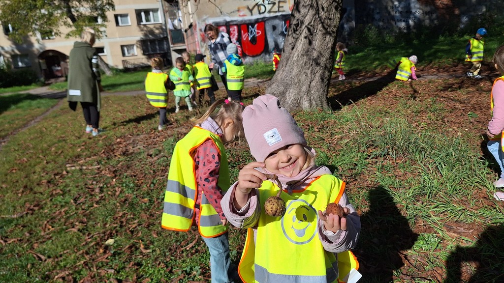 By utrwalić wiedze o skarbach jesieni we wrześniu wybraliśmy się na spacer. Naszym celem był kasztanowiec i zbieranie kasztanów, ale po drodze zaglądaliśmy do ogródków, oglądaliśmy i nazywaliśmy drzewa, zbieraliśmy liście. W tym roku jesień jest niezwykle kolorowa.