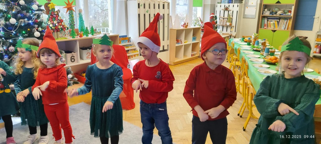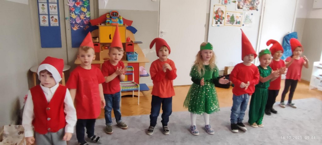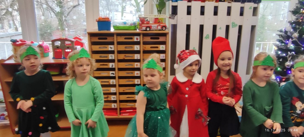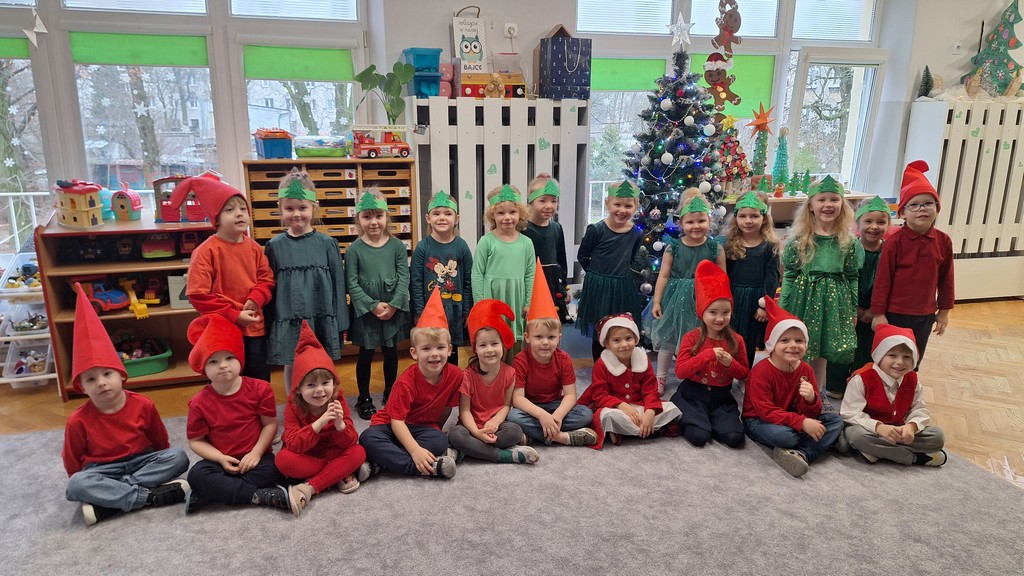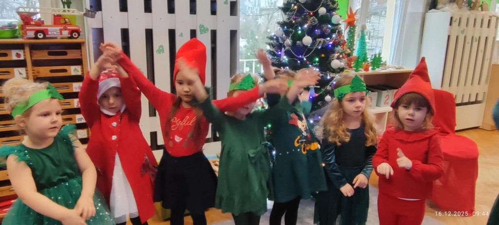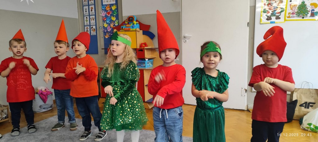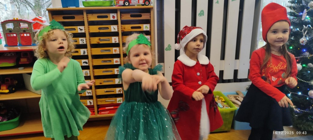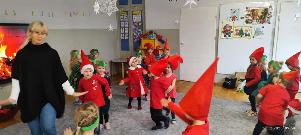Występ dla rodziców w przedstawieniu świątecznym jest bardzo ważny dla dzieci. Miesza się radość z podekscytowaniem i tremą. Od samego rana wszyscy żyją tym wydarzeniem. Wszyscy włożyliśmy dużo pracy w nasz występ w roli choinek i krasnali, ale warto było, bo wszystko fantastycznie się udało. Brawo dzieciaki. A przed występem dla oderwania myśli dzieci bawiły się przy piosenkach świątecznych.