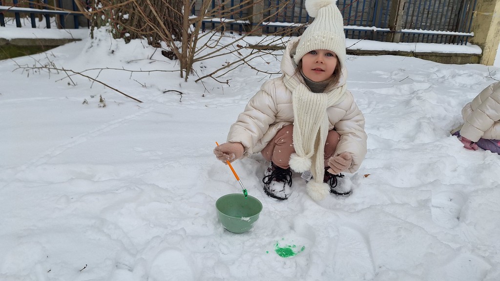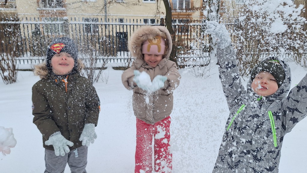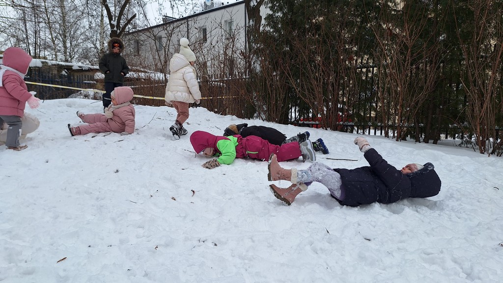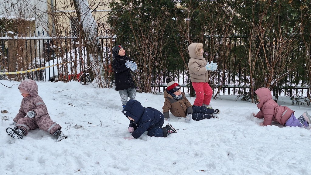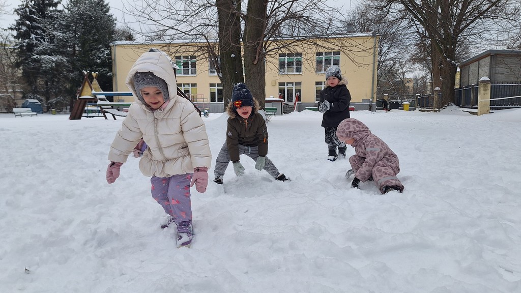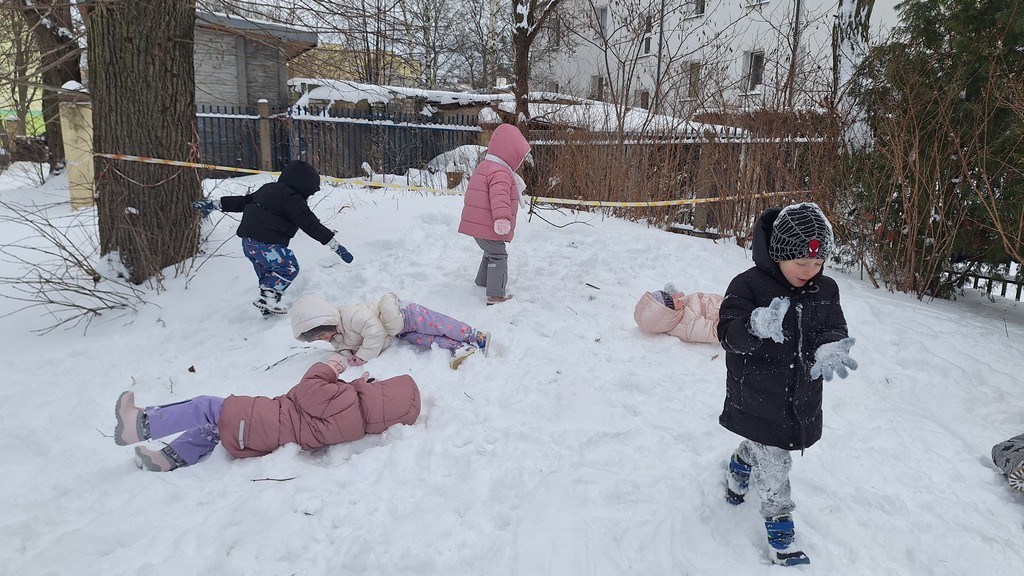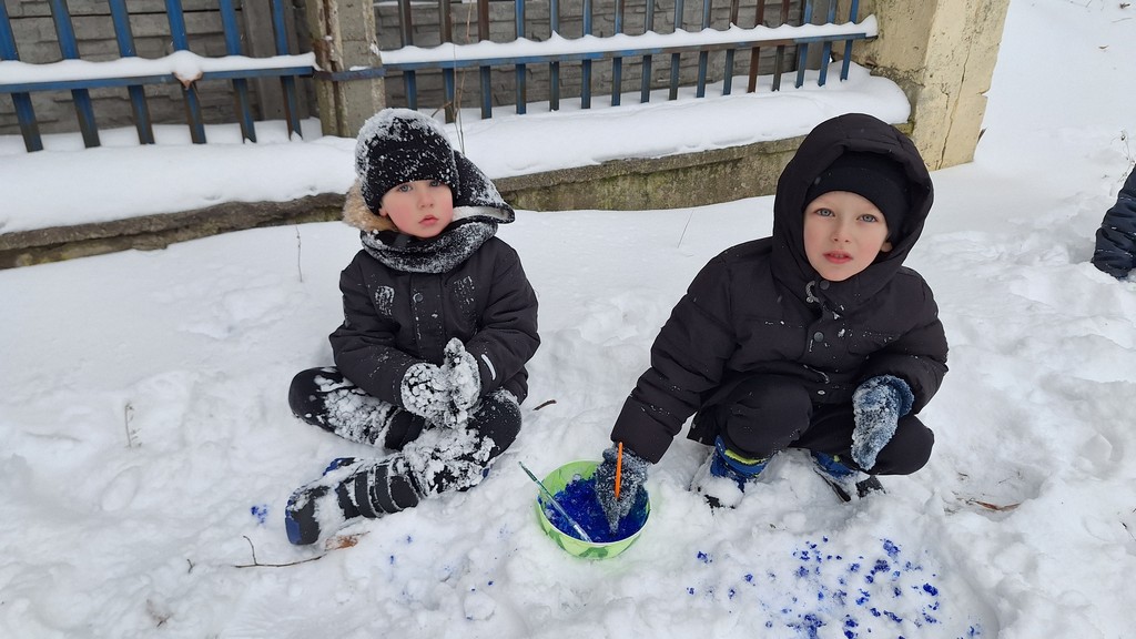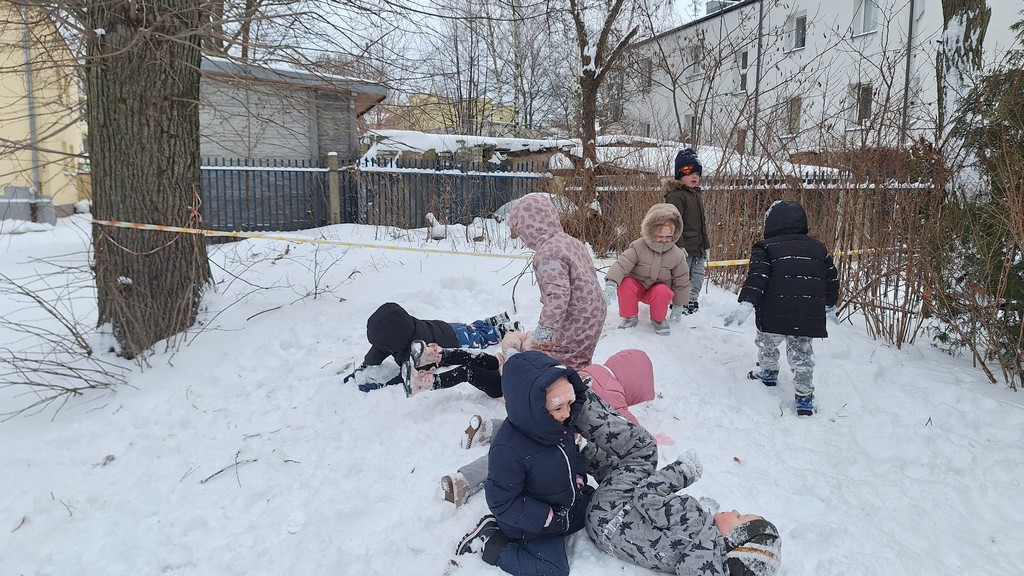 Korzystając z fantastycznej zimowej aury spędziliśmy kilka dni na fantastycznej zabawie w naszym ogrodzie. Tym razem było wyjątkowo biało i zupełnie inaczej niż zawsze. Robiliśmy na śniegu aniołki, traktorki, zajączki. Zbiegaliśmy z górki na pazurki, a nawet turlaliśmy się z górki. Rzucaliśmy się śnieżkami i podrzucaliśmy puszysty śnieg. Było dużo śmiechu i radości. Ostatniego dnia sprzyjającej pogody malowaliśmy śnieg farbami i rozwiązywaliśmy zagadkę czy śnieg jest czysty. Następnym razem zorganizujemy sobie sanki.